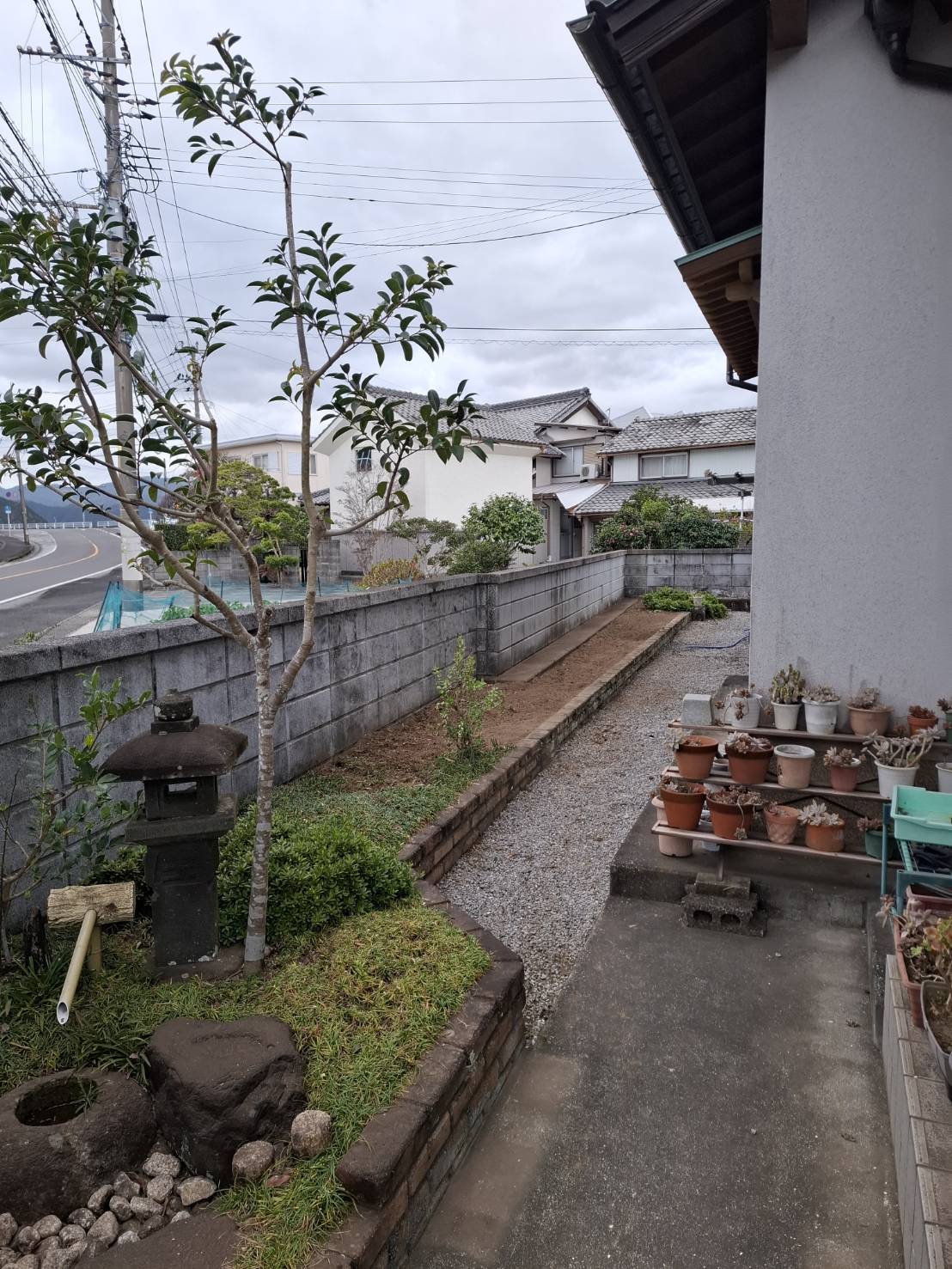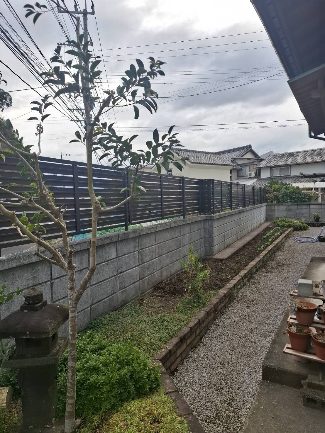 LIXILフェンスABの取付け。 下空き寸法が狭く家族のプライバシーを守る仕様になっています。 ※完全に潰すことも可能です。